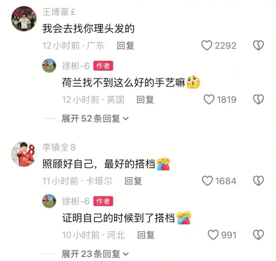 U23国足的队友们在评论区纷纷留言,包括木塔力甫、向余望、王博豪、杨希、李镇全、彭啸、贺一然等人,其中木塔力甫评论“加油狼队球员”,徐彬一一回复,IP显示已在英国。