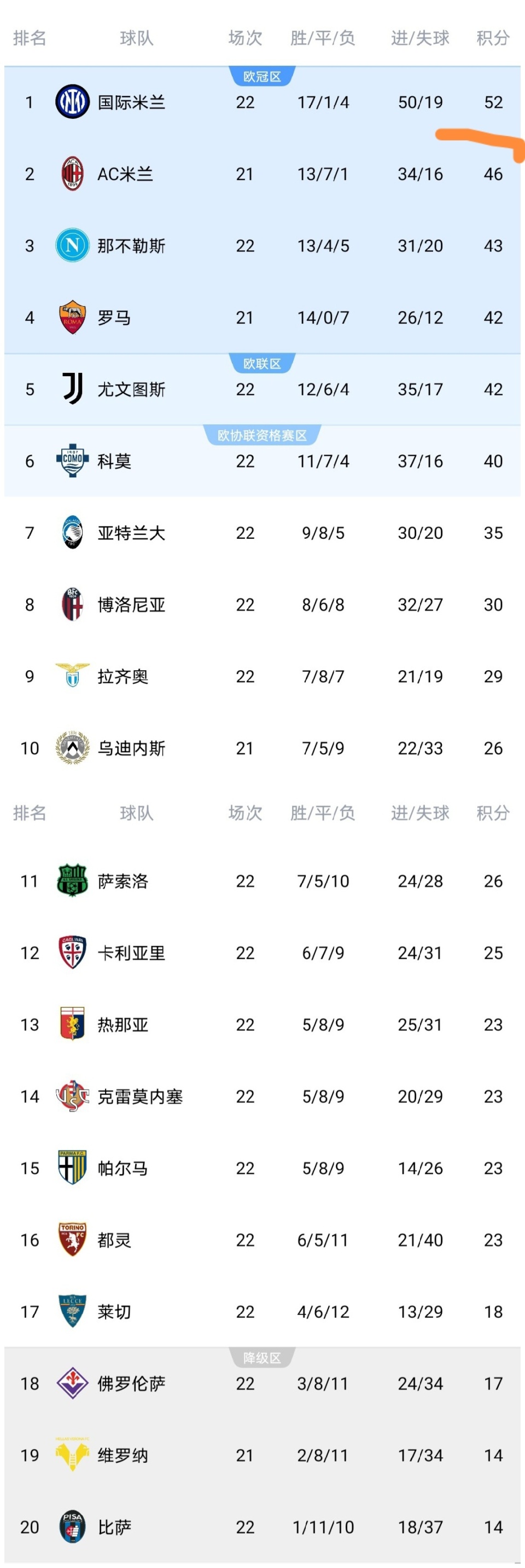 可以看到那不勒斯输球之后积分停留在了43分继续排名第3,落后榜首的国际米兰队9分,这显然是天助国际米兰的事情。而尤文图斯击败那不勒斯队之后,积分上涨到了42分,排名第5,可以看到尤文图斯的积分追平了罗马队,可以说尤文图斯队逼近意甲积分榜前四了,而亚特兰大大胜帕尔马队之后,积分上涨到了35分,仅差第6的科莫队5分,亚特兰大已经逼近了欧战席位区,亚特兰大厉害了,排名不断上升。帕尔马输球之后积23分排名第15。热那亚击败博洛尼亚队之后积23分远离了降级区,而博洛尼亚输球之后积30分继续排名第8。