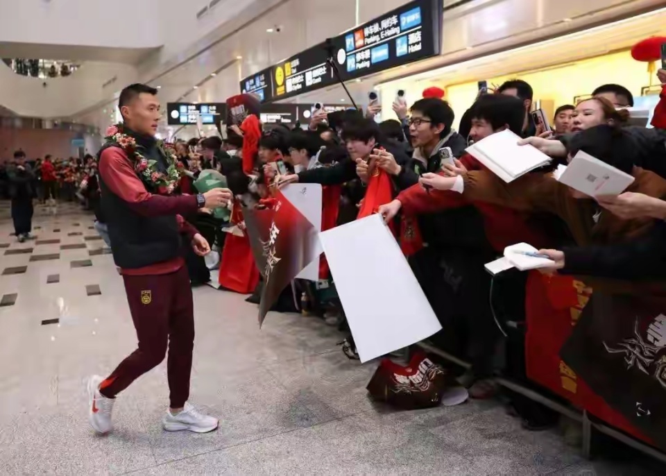 看到有这么多前来接机的球迷,球队上下非常高兴,球员包括教练组围着编织的鲜花,穿着红色的短袖T恤,笑容满面地与现场球迷互动、签名。