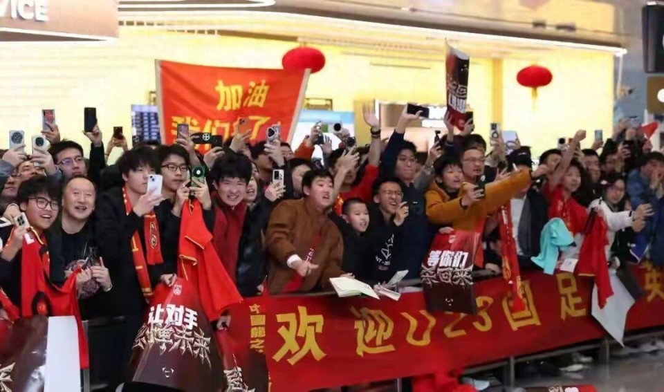 成百上千名球迷身穿国家队红色球衣、手持鲜花来到机场欢迎小将们的凯旋。