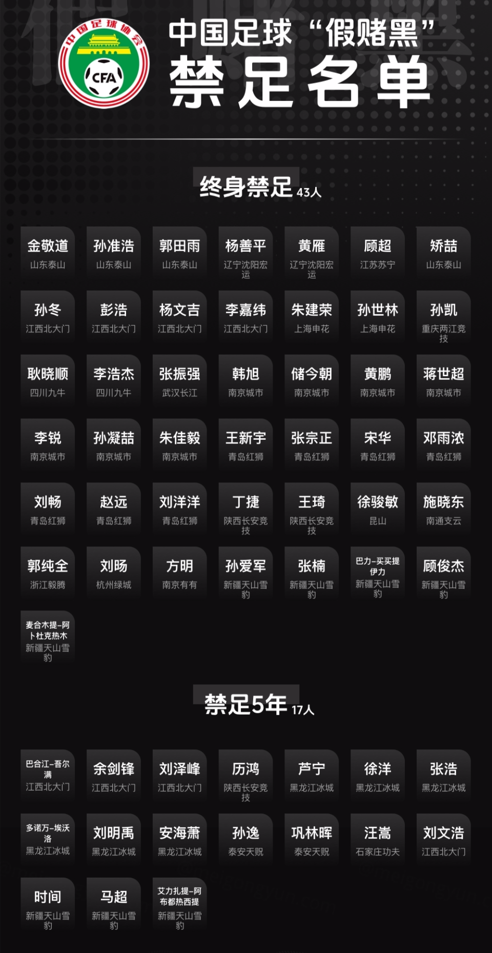 当时,中国足协公布首批禁足处罚名单,多达60人被罚,其中金敬道、孙准浩、郭田雨,顾超等43人被处罚终身禁足,而老将汪嵩等17人则被禁足5年。