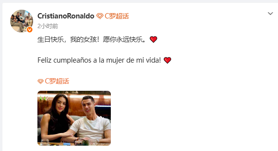 1月28日,C罗晒合照给未婚妻乔治娜庆生:生日快乐,我的女孩!愿你永远快乐。❤️Feliz cumpleaños a la mujer de mi vida! ❤️