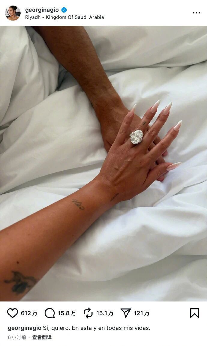 2025年8月12日,C罗向乔治娜求婚成功。乔治娜社媒晒出与C罗的牵手照,左手佩戴一枚巨型钻戒,表示同意C罗的求婚。她配文:"是的,我愿意。此生此世,生生世世。"2016年,C罗效力皇马期间,两人恋情正式公开,二人相恋至今已近九年,两人育有两名女儿。