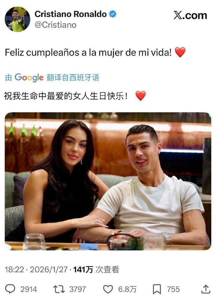 1月27日,C罗在社交媒体上发文,祝乔治娜32岁生日快乐。