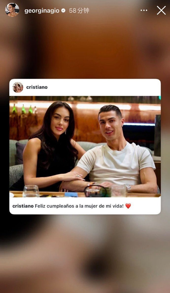 C罗晒出与乔治娜亲密合照,并配文写道:“祝我生命中最爱的女人生日快乐! ❤️”