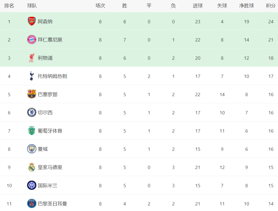 阿森纳是欧冠唯一小组赛8场全胜的球队,锁定第1晋级16强。阿森纳是欧冠36队赛制以来首支联赛阶段全胜的球队。阿尔特塔真是神了。 毫无疑问,阿森纳就是夺冠最大热门,进攻和防守都做得非常出色。英超球队在这次欧冠小组赛表现都很出色,有5支球队直接晋级淘汰赛,除了阿森纳之外,利物浦、热刺、切尔西和曼城都直接晋级16强。