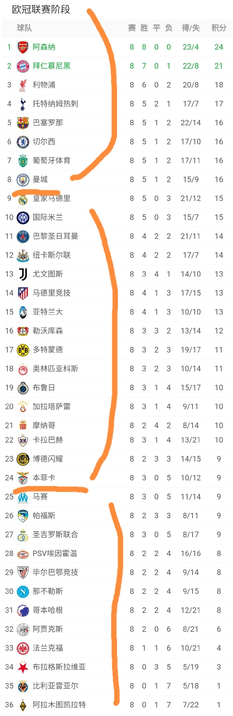 可以看到8支直通欧冠16强的球队有5支英超的球队,分别是阿森纳、利物浦、热刺、切尔西、曼城。可以看到英超真是独领风骚啊。而在直通榜单中没有意甲和法甲的球队,仅1支西甲的球队,1支德甲的球队,1支葡超的球队。