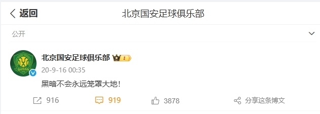2020赛季,中超第11轮赛后,国安最后时刻3-3被华夏逼平,国安方面表示,针对比赛中出现的争议判罚,俱乐部已经决定上诉。国安官微当时发布的文字,就是争议性十足的“黑暗不会永远笼罩大地”。