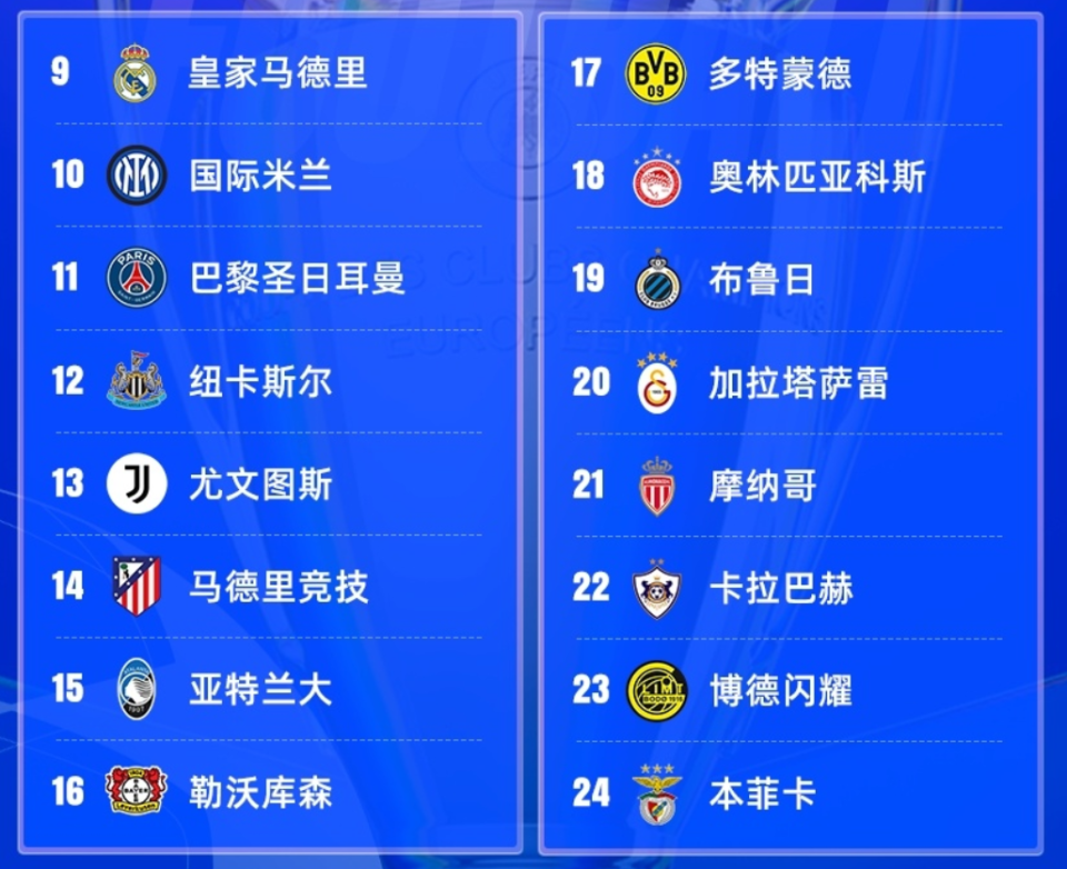 也就是说按着比赛成绩来分,目前只存在四组比赛对阵,分别是摩纳哥、卡拉巴赫对巴黎圣日耳曼、纽卡斯尔,布鲁日、加拉塔萨雷对尤文图斯、马德里竞技,博德闪耀、本菲卡对皇马、国米,多特蒙德、奥林匹亚科斯对亚特兰大、勒沃库森。
