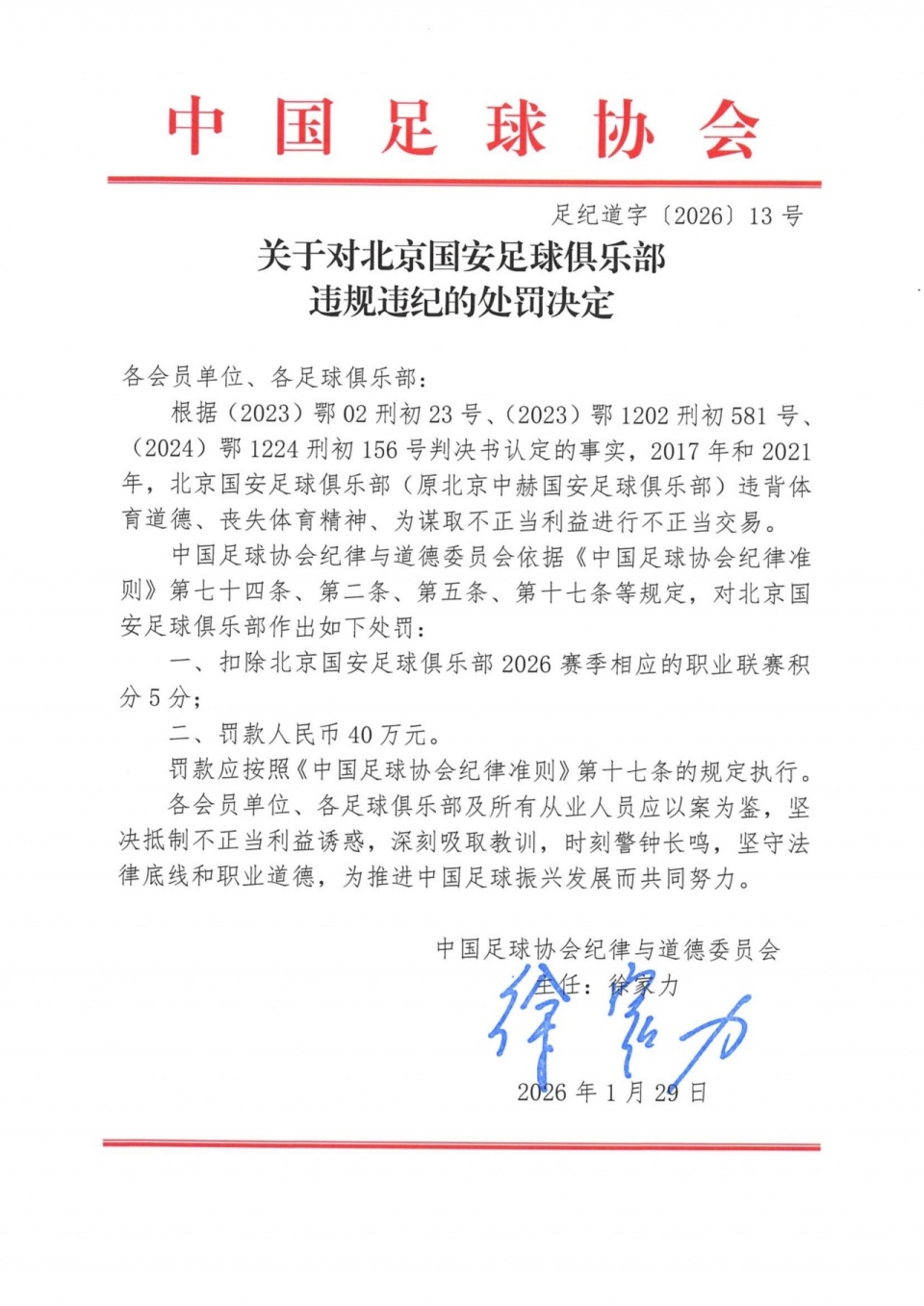 北京时间1月29日,中国足协官方对北京国安俱乐部扣除5分,罚款40万元,国安俱乐部官方进行回应引起热议,目前已删文。