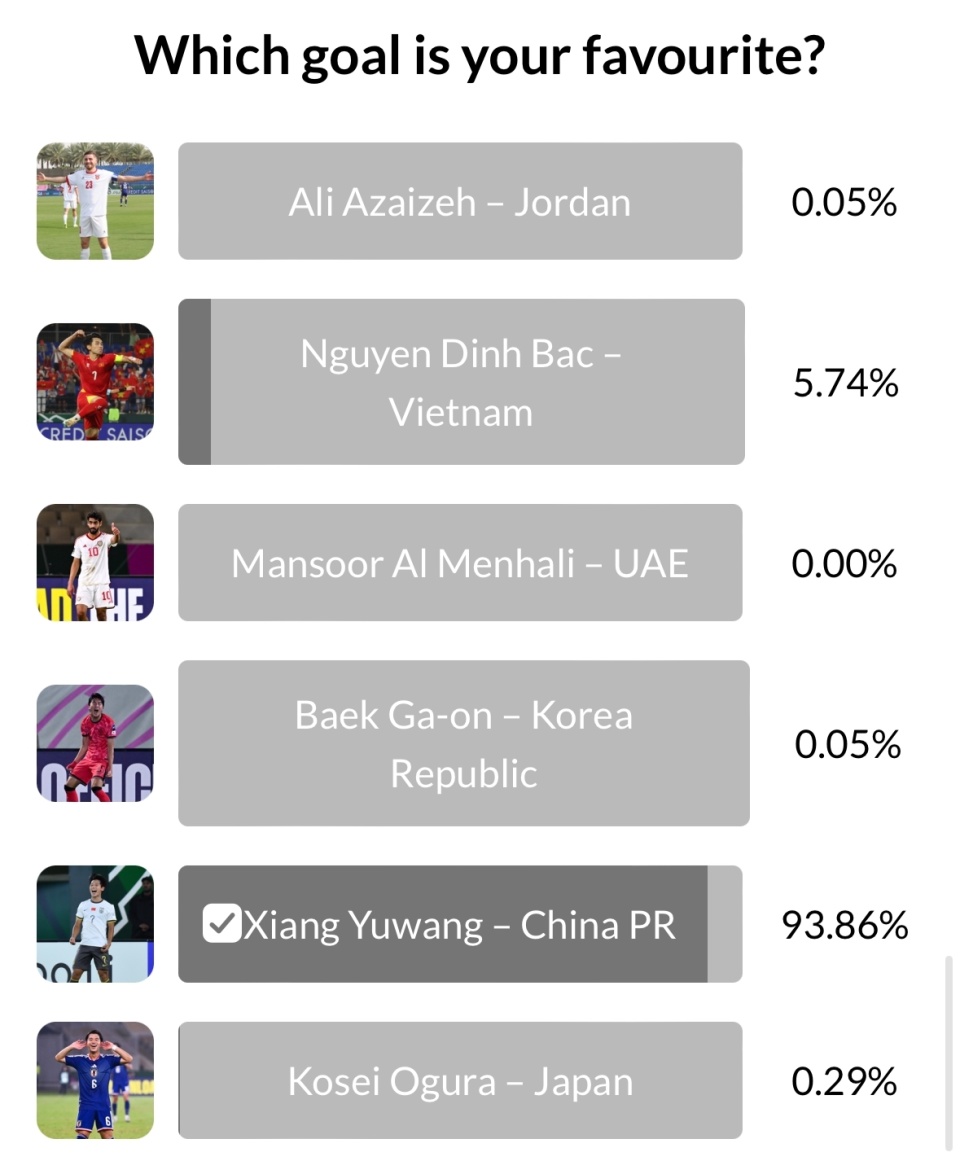 5粒淘汰赛最佳进球评选中,向余望在与越南队半决赛时打进一粒进球,以93.86的得票率遥遥领先,拿下这一奖项几乎不存在悬念。