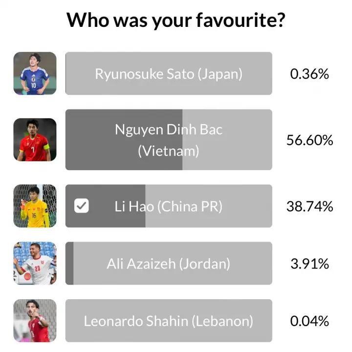 暂时排在榜首的是越南头号球星阮庭北,即时投票占比为56.60%,领先中国球员李昊不少,不过随着投票网址的公布,相信会有更多的中国球迷为李昊投票,最后完成逆转有很大可能。