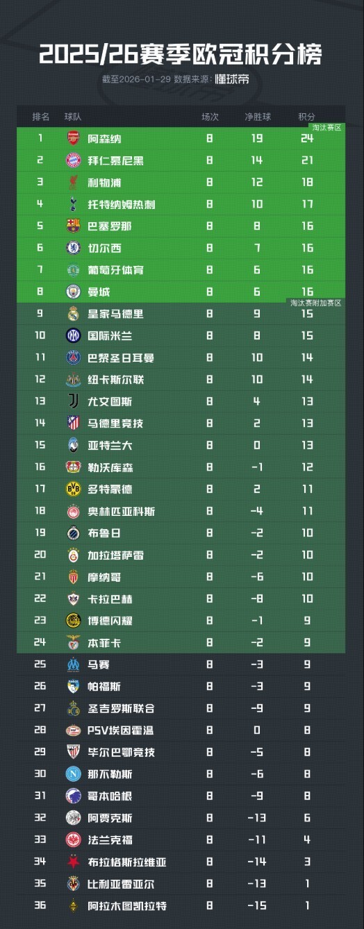 北京时间1月29日,欧冠联赛阶段结束。联赛阶段抽签时的九支第四档球队。其中四支球队进入附加赛,五支球队遭直接淘汰。