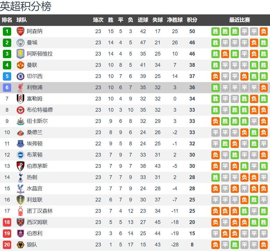第一:两队情况!英超23轮战罢,利物浦10胜6平7负积36分排名第六,纽卡斯尔9胜6平8负积33分排名第九。上轮英超,利物浦客场2-3不敌伯恩茅斯,各项赛事13场不败被终结,周中欧冠主场6-0大胜卡拉巴赫;纽卡斯尔主场0-2不敌阿斯顿维拉,联赛4轮不败遭终结,周中欧冠客场1-1战平巴黎。