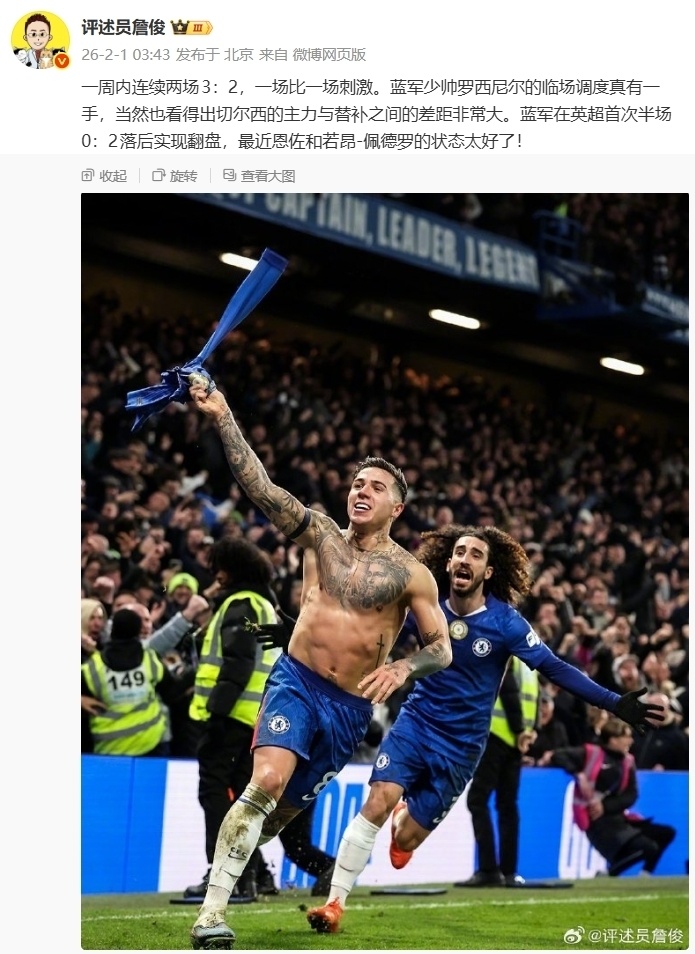 恩佐的绝杀,是其蓝军生涯150场里程碑的璀璨注脚(27球27助),更是这种精神在新时代的传承。从0-2到3-2,球队展现出的不是侥幸,而是一种“要么赢,要么死”的信念。正如著名评论员詹俊所言:“蓝军少帅罗塞尼尔的临场调度真有一手。” 而加里·内维尔则感慨:“切尔西总能在同一场比赛中展现出截然不同的面貌……在关键时刻却突然爆发,成为一股强大的力量。” 这种“变身”能力,正是昔日那支切尔西最特色的价值。