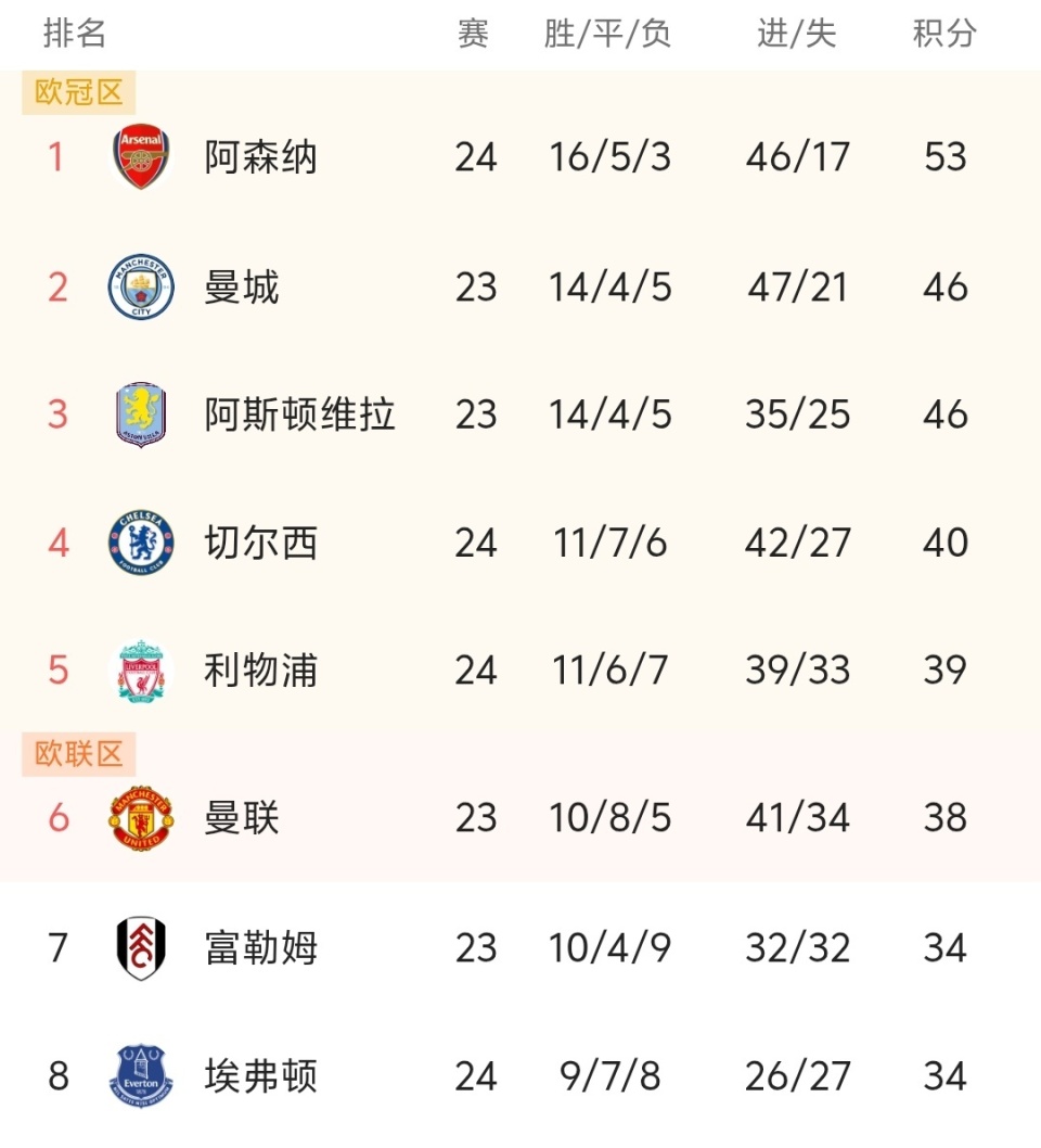 北京时间2月1日,英超联赛第24轮开打,利物浦主场4-1大胜纽卡斯尔联队,终结了5轮不胜的尴尬局面,目前利物浦11胜6平7负,暂居积分榜第5,领头羊阿森纳客场4-0大胜利兹联,在先赛一场的情况下,阿森纳以7分的优势领跑,切尔西主场3-2绝杀了西汉姆联队,利物浦和切尔西都赢球,给了曼联不小的压力,目前曼联被挤出了欧冠区域,他们本轮至少要打平才能回归前5!