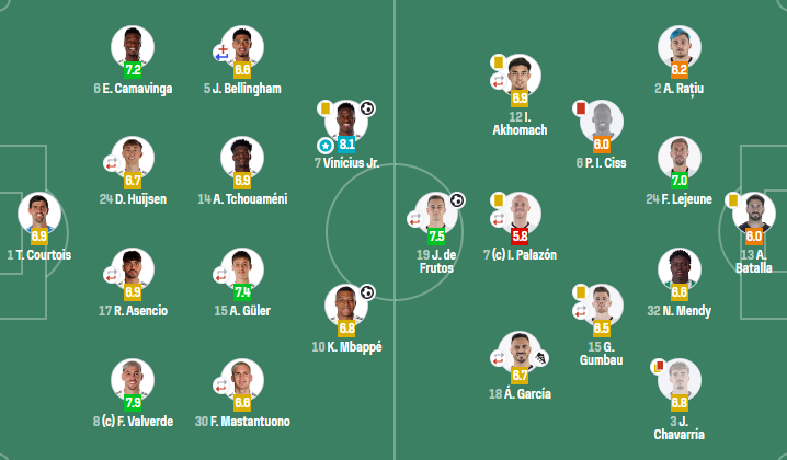 皇家马德里(4-4-2):库尔图瓦;巴尔韦德,劳尔-阿森西奥(46'塞瓦略斯),赫伊森(77'阿拉巴),卡马文加;马斯坦托诺(60'冈萨洛-加西亚),居莱尔(77'罗德里戈),琼阿梅尼,贝林厄姆(10'布拉欣-迪亚斯);姆巴佩,维尼修斯