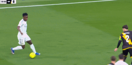 第15分钟,维尼修斯在前场左路带球,开启华丽的个人表演。面对3人防守,巴西人强行突破后兜射远角命中,皇马1-0领先。维尼修斯终结了个人长达13轮的进球荒。进球后,他亲吻了皇马队徽。