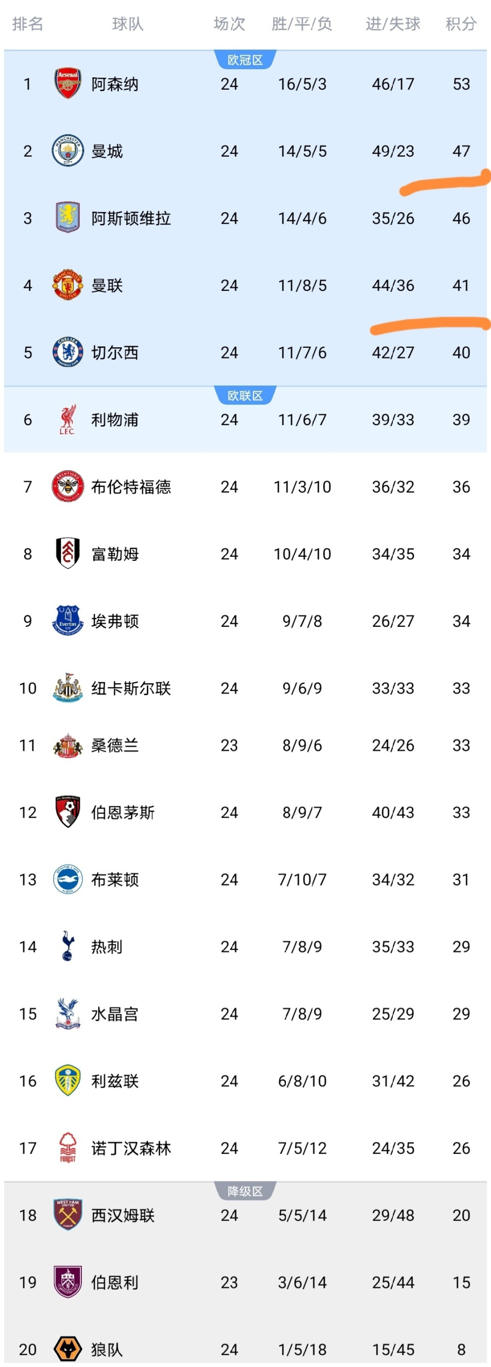 今天凌晨,英超第24轮结束多场较量,曼联、曼城、维拉等队出战,这些比赛之后,英超积分榜发生变化,我们来看看。
