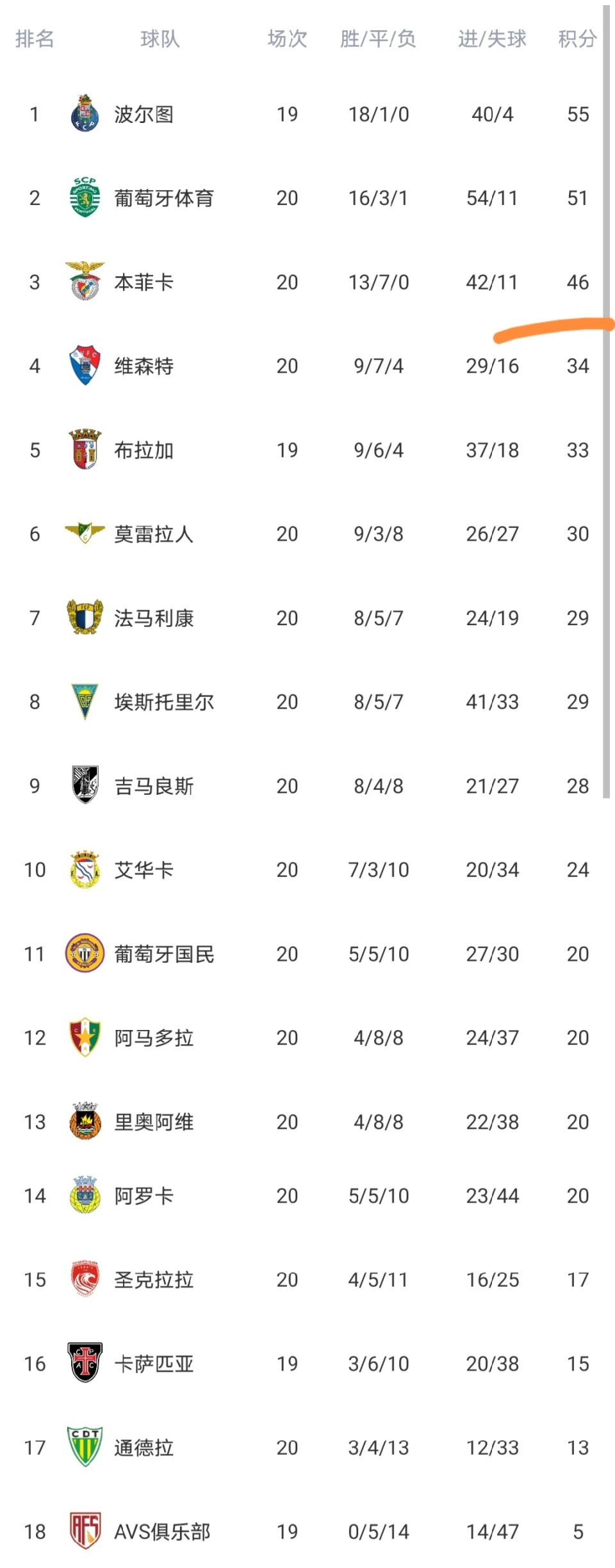 可以看到葡萄牙体育队击败葡萄牙国民之后,积分上涨到了51分,追到仅差榜首的波尔图队4分,如果本轮波尔图队输球,那么葡萄牙体育队就真的逼近榜首了,葡超争冠也会悬念更大。而穆帅执教的本菲卡队爆大冷门0-0之后,积分仅上涨到46分,落后第2的葡萄牙体育队5分,同时落后榜首的波尔图队9分,只能希望波尔图队本轮输球,否则本菲卡队跟榜首的分差将进一步拉大,穆帅想率队夺冠恐怕很难了。维森特大胜之后,积分上涨到了34分,排名第4了,领先第5的布拉加队1分。