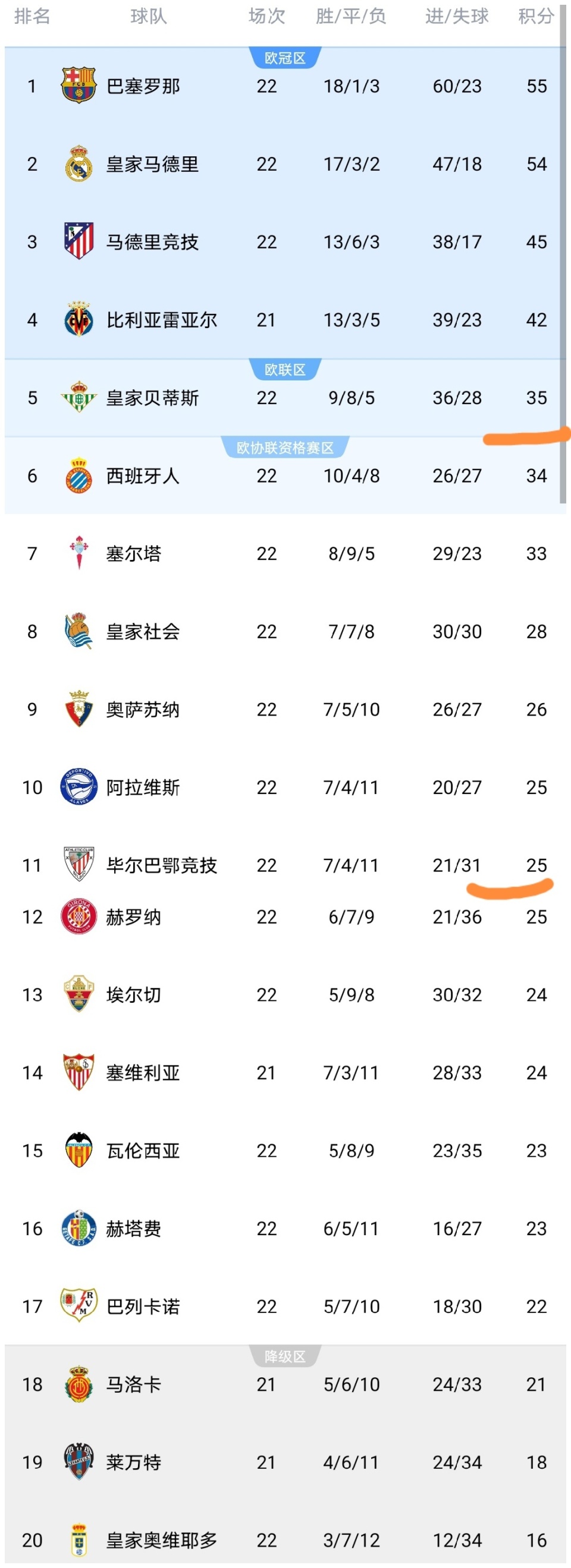 可以看到皇马击败巴列卡诺队之后,积分已经上涨到了54分,依然紧咬榜首的巴萨,分差仅1分,皇马巴萨的冠军之争异常胶着,非常激烈啊。巴列卡诺队输球之后积分停留在了22分,排名第17,仅领先降级区1分,巴列卡诺队保级压力巨大。贝蒂斯击败瓦伦西亚之后,积分上涨到了35分,排名已经攀升到了第5的位置,距离前四仅7分的分差,比利亚雷亚尔队要小心了,皇家贝蒂斯队看到了冲击欧冠席位的希望。瓦伦西亚输球之后积分停留在了23分,也是有较大保级压力。塞尔塔被逼平之后,积分仅上涨到33分,排名第7,无缘反超西班牙人,可惜了。赫塔费队积23分排名第16,毕尔巴鄂竞技队积25分排名第11,皇家社会排名第8。