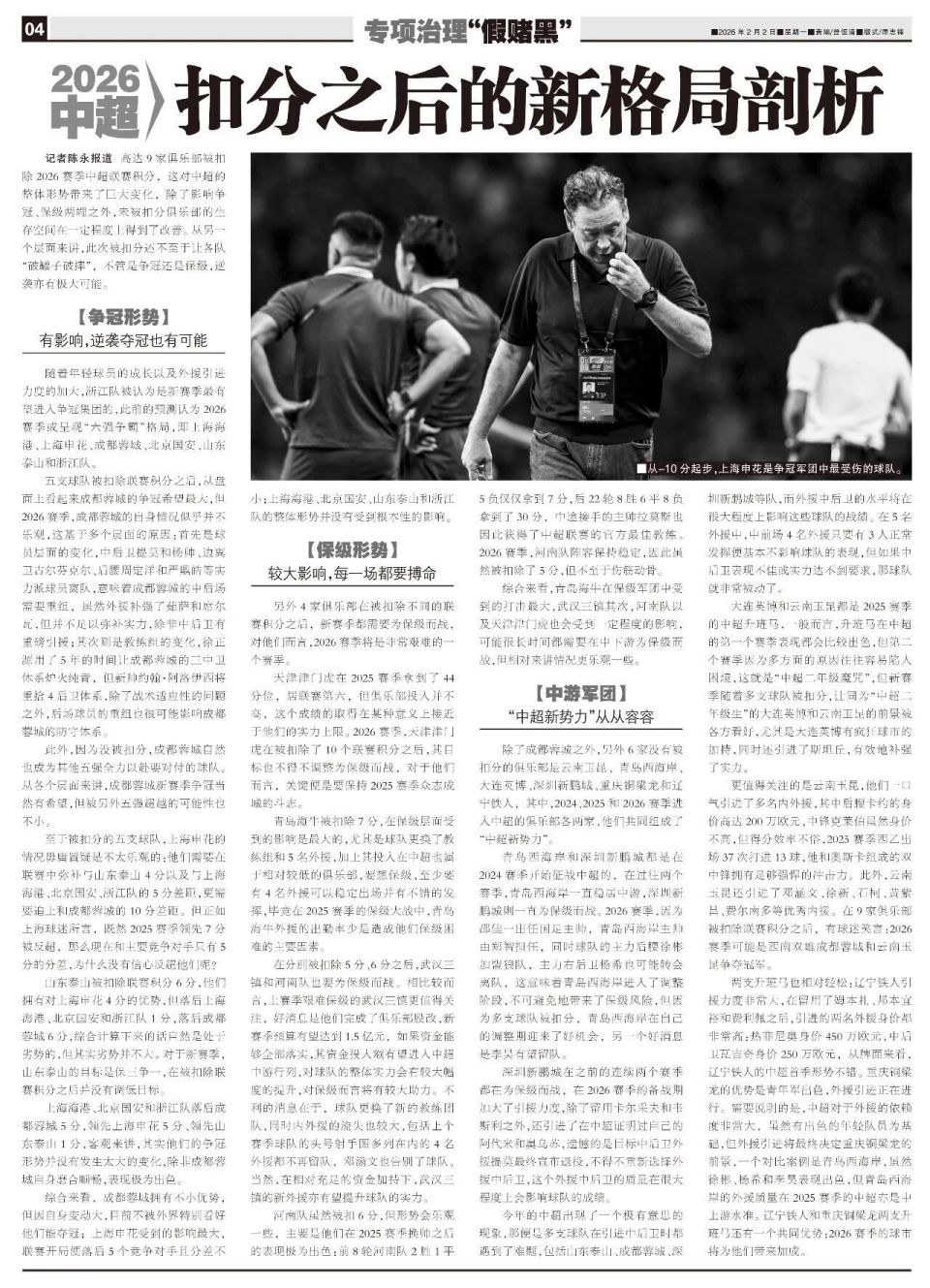 记者陈永报道 高达9家俱乐部被扣除2026赛季中超联赛积分,这对中超的整体形势带来了巨大变化,除了影响争冠、保级两端之外,未被扣分俱乐部的生存空间在一定程度上得到了改善。从另一个层面来讲,此次被扣分还不至于让各队“破罐子破摔”,不管是争冠还是保级,逆袭亦有极大可能。