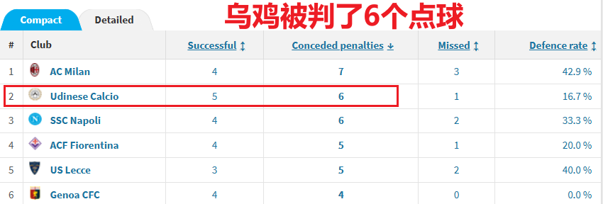 值得一提的是,乌鸡是本赛季意甲被判点球第二多的球队(6粒),仅比米兰少一粒。