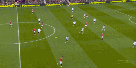 然后在不断的连续进攻当中,卡塞米罗找到了库尼亚,让曼联打进了第二球,但在库尼亚的进球之外,不要忘记曼联之所以能来到前场,是源自梅努在后场的带球和斜传: