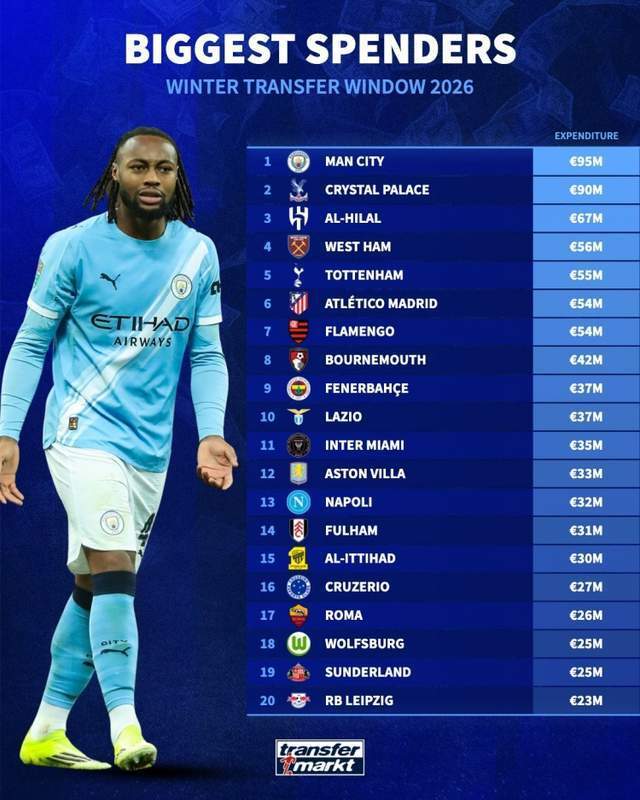 冬季转会窗已经关闭,德国转会市场盘点了足坛各队引援花费情况,曼城以9500万欧居首的,水晶宫以9000万欧位居次席的。