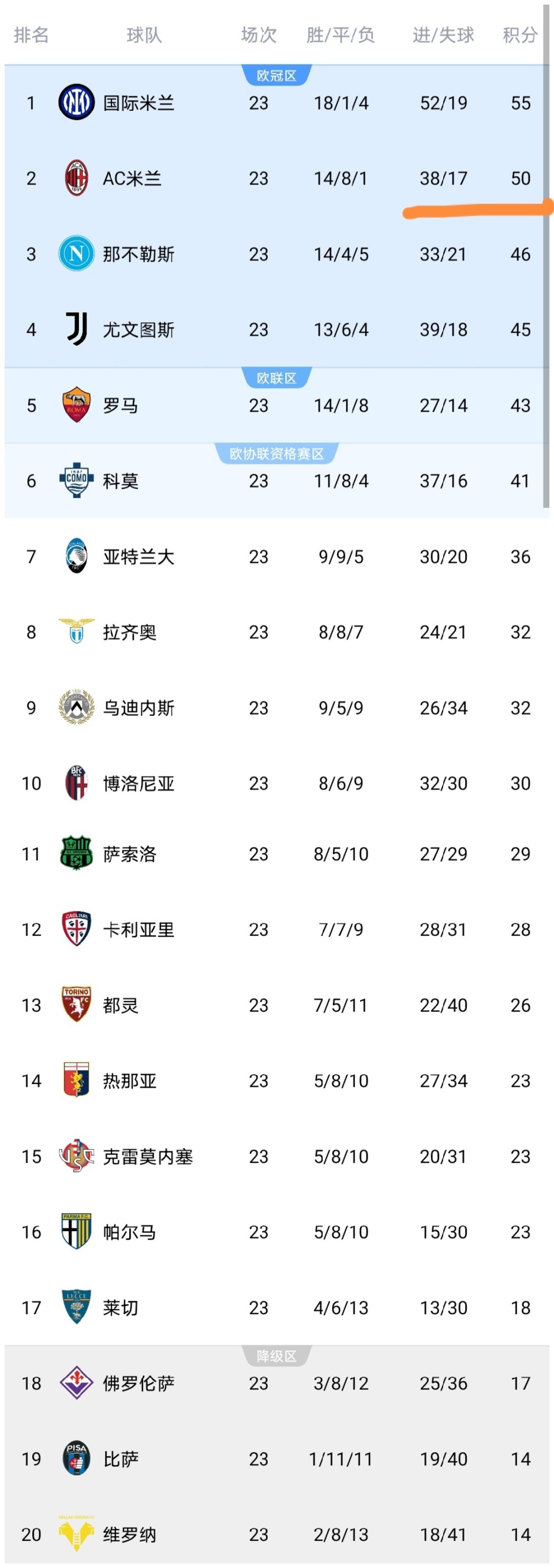 可以看到AC米兰在取得了一场3-0的完胜之后,积分上涨到了55分,继续保持较大争冠希望,可以说AC米兰是唯一一支还有可能跟国际米兰争冠的球队了,其他球队想争冠都比较难了。所以国米目前最大的竞争对手就是AC米兰了。以目前AC米兰的状态,完全有能力竞争冠军,而国米需要小心了,不能犯错随意丢分啊。