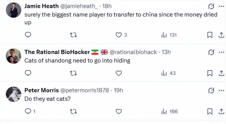 正因如此,祖马加盟山东泰山的消息引起了欧洲球迷的兴趣,但也多是以嘲讽和奚落为主。在祖马可能前往中国踢球的消息下方,有法国球迷评论称:“一个虐猫的人去中国踢球并不奇怪。”还有英国球迷表示:“山东的猫们现在要注意安全了。”“真巧,祖马现在能尝尝猫肉了。”