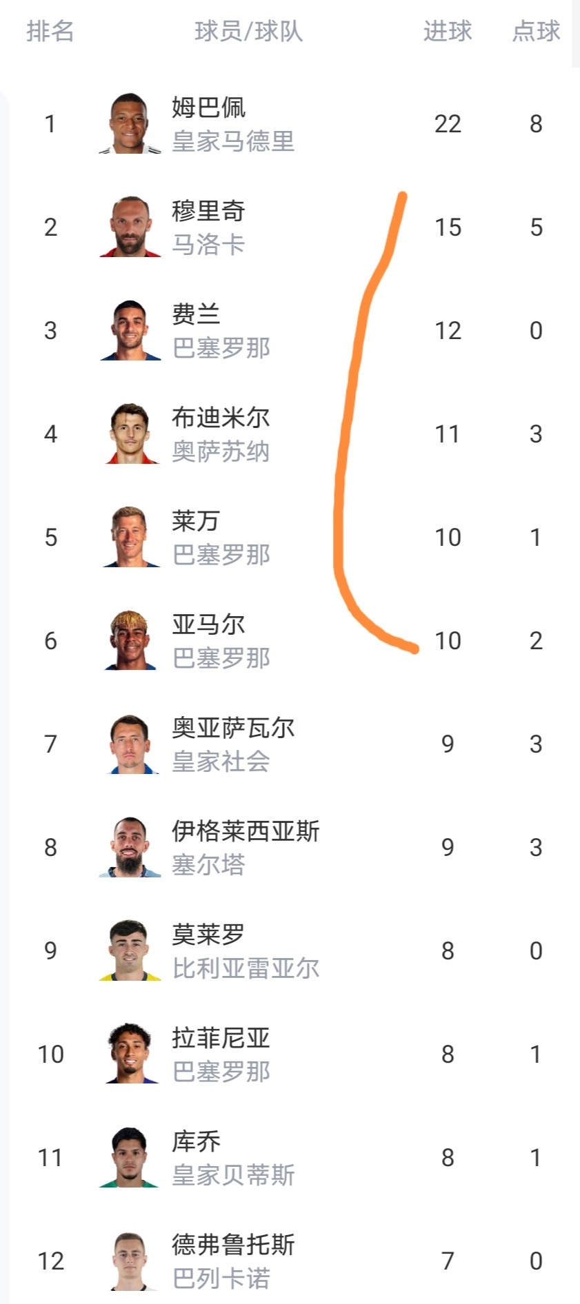 射手榜穆里奇等5人进球在10-15之间,姆巴佩领先7球。