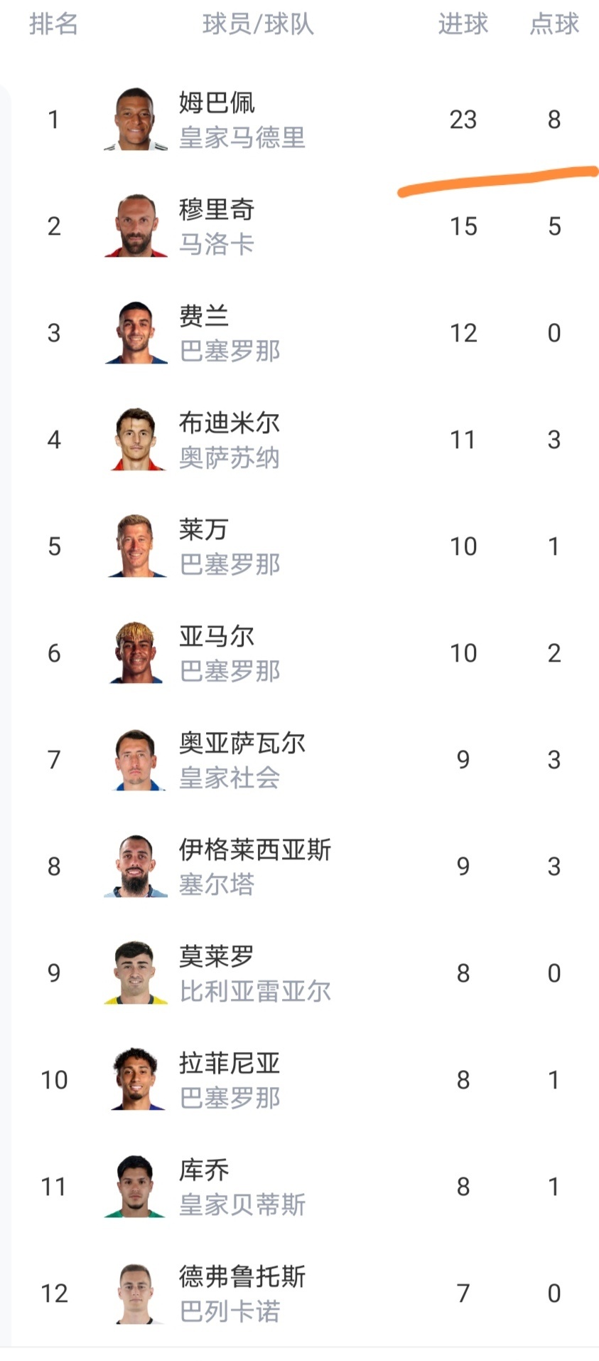 射手榜姆巴佩领先8球,优势很大。