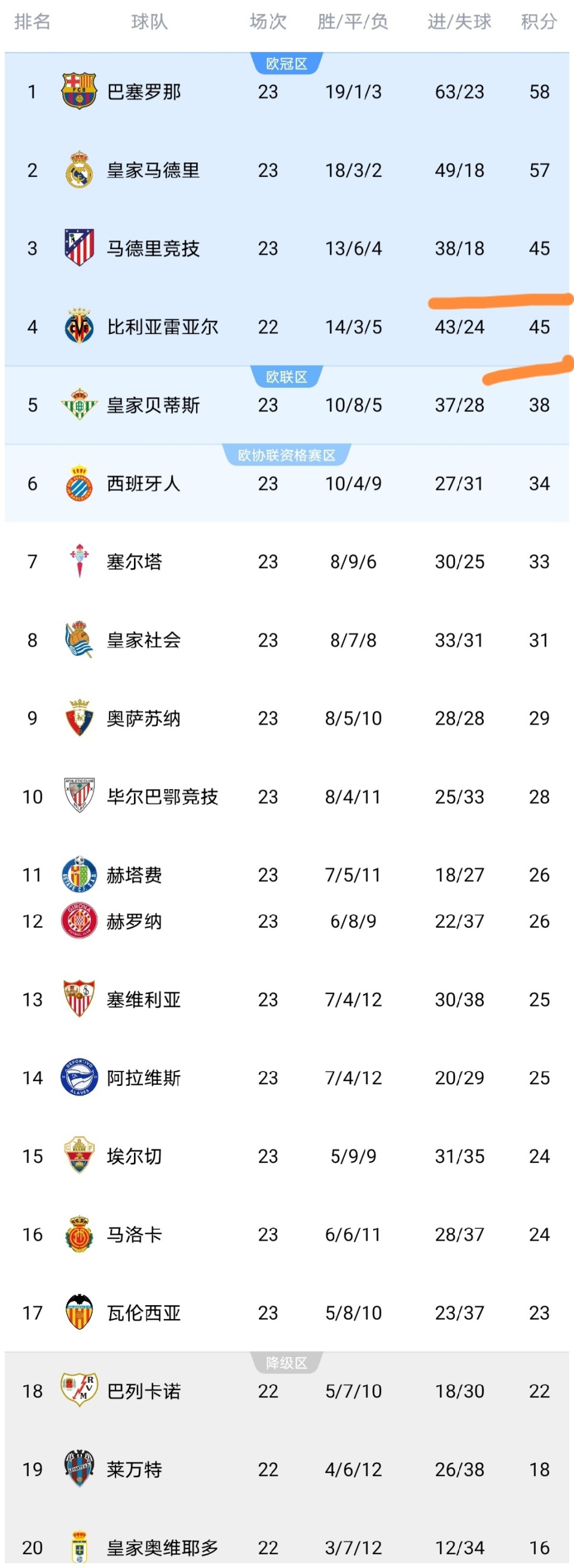 可以看到比利亚雷亚尔队击败西班牙人队之后,积分上涨到了45分,少赛一轮积分追平了马德里竞技队,马竞要小心了,比利亚雷亚尔队对西甲季军发起强有力的冲击。而西班牙人输球之后,积分停留在了34分,落后第5的皇家贝蒂斯队4分,可以看到西班牙人队最近的排名不断下跌,已经跌出了前五,令人唏嘘啊。