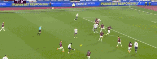 第50分钟,迪乌夫后场长传,卢克-肖冒顶,绍切克策动反击,随后接应鲍恩的传中,门前巧射命中,西汉姆联打破僵局,1-0!