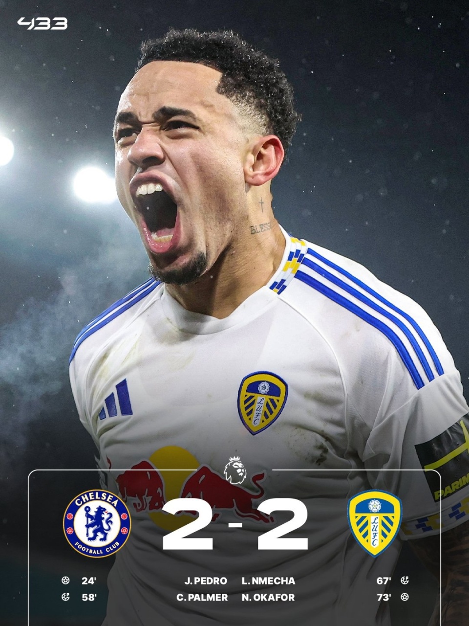 切尔西主场2-2战平利兹联,英超4连胜终结。若昂-佩德罗破门+造点,帕尔默主罚扩大比分,凯塞多送点,恩梅查点射,奥卡福扳平,补时阶段帕尔默失空门。