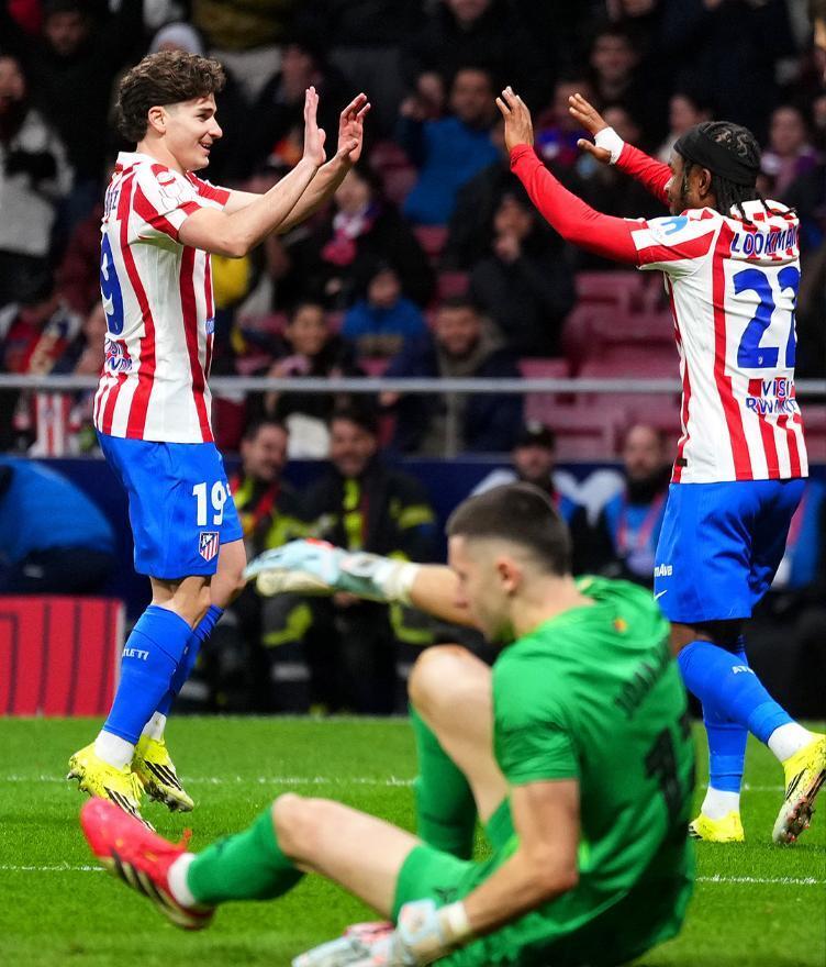 继续猛攻的马竞,在第34分钟再次取得进球,阿尔瓦雷斯禁区内接到队友倒三角传中后,无私分给了左路位置更好的卢克曼,后者轻松推射建功,将比分改写为了3-0,半场比赛结束之前,阿尔瓦雷斯大禁区线附近大力抽射,终结了连续11场的进球荒,帮助马竞带着4-0的比分,回到了中场更衣室。