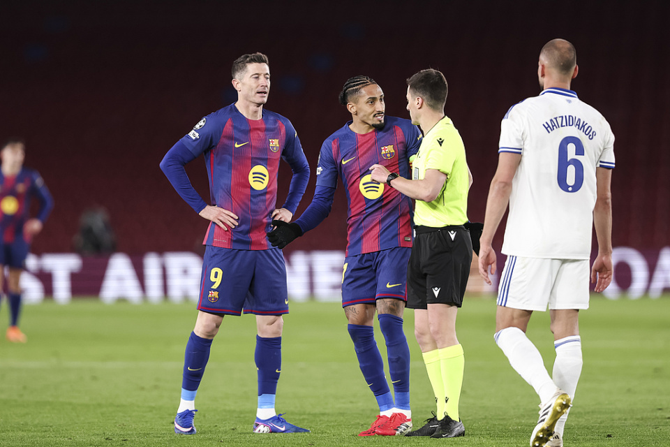 虽然巴萨在前场摆出了奥尔莫、费兰和亚马尔的三叉戟,弗里克又在上半场就用莱万多夫斯基换下卡萨多,增加前场攻击手的人数,然而巴萨全场比赛还是没能收获任何一个进球,可见缺了拉菲尼亚,巴萨真的玩不转。