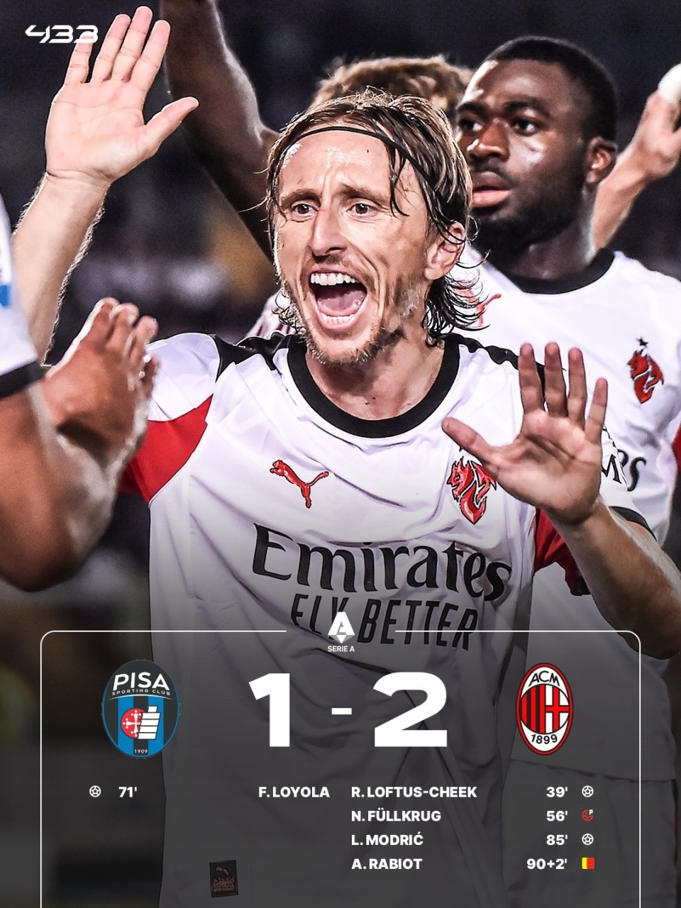 意甲第25轮,AC米兰2-1击败比萨,暂落后榜首5分。奇克破门首开纪录。拉比奥打进一球但是因菲尔克鲁格手球犯规在先被吹,菲尔克鲁格罚丢点球,洛约拉扳平,40岁的莫德里奇破门,拉比奥两黄一红被罚下。