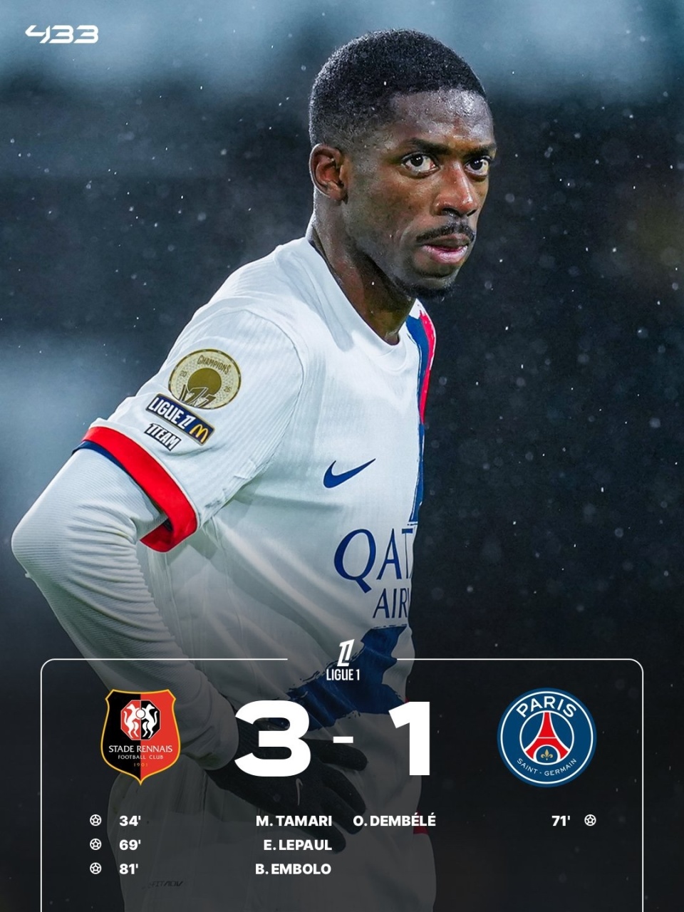 法甲第22轮,巴黎圣日耳曼客场1-3不敌雷恩,终结联赛7连胜。杜埃错失单刀良机,塔马里首开纪录,勒波尔扩大领先优势,登贝莱扳回一城,恩博洛锁定胜局。