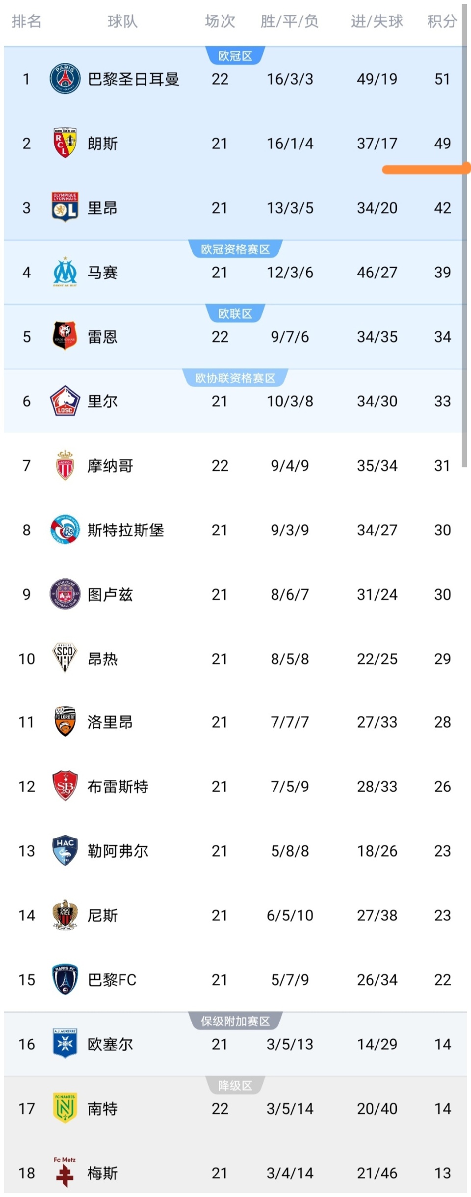 可以看到巴黎圣日耳曼队爆大冷门输球之后,先赛一场的情况下,积分停留在了51分,仅比第2的朗斯队多2分,也就是意味着如果本轮朗斯队击败实力不强的巴黎FC队,那么巴黎圣日耳曼队的榜首位置就将被朗斯队取代。法甲冠军的争夺真是太激烈了,朗斯和巴黎圣日耳曼队不断在榜首轮换。而摩纳哥击败南特队之后,积分上涨到了31分,摩纳哥队仅差第6的里尔队2分,可以说摩纳哥逼近前六了,也就是逼近了欧战席位区。雷恩赢球之后积分上涨到34分,仅差第4的马赛队5分。
