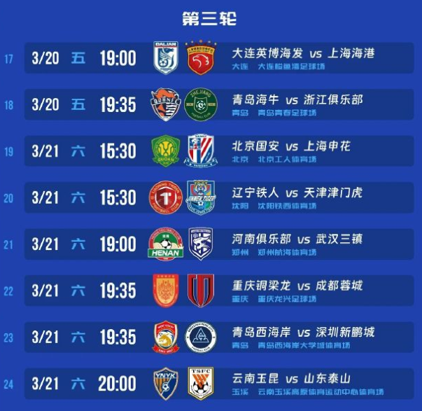 3月6日,中超揭幕战将在成都进行,成都蓉城将主场对阵深圳新鹏城,首次为成都蓉城出场的拜合拉木就将对阵老东家。辽宁铁人、重庆铜梁龙分别客场对阵山东泰山、天津津门虎,这将是两支球队的中超处子秀。