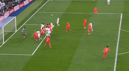 第90分钟,居莱尔开出任意球,维尼修斯抢点破门,进球被判无效。