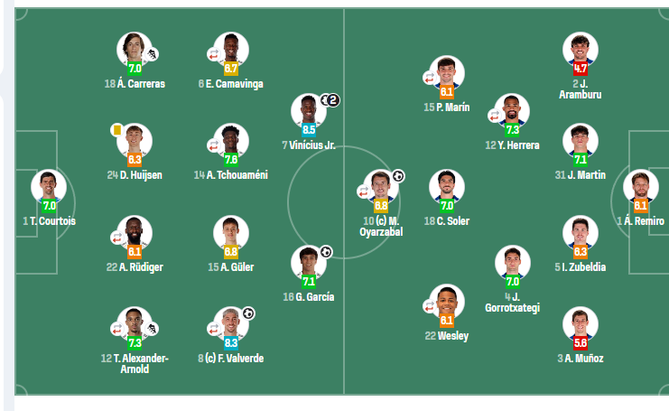 未登场替补:13-卢宁、20-弗兰·加西亚、23-费兰·门迪、10-姆巴佩、30-马斯坦托诺、17-阿森西奥、38-帕拉西奥斯