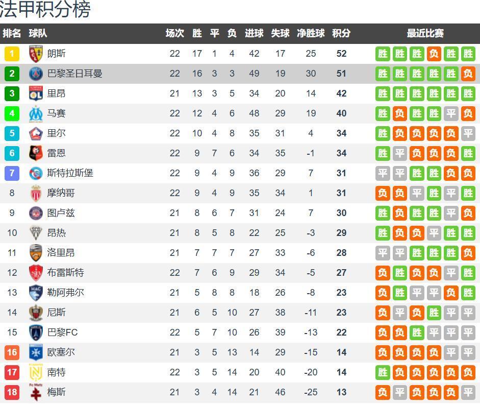 法甲原本是五大联赛中最有争冠悬念的联赛,因为巴黎在法甲那就是一家独大,因为法甲高薪球员前十全在巴黎队内,巴黎又是上赛季的三冠王,但本赛季巴黎联赛成绩反而不够稳定。法甲22轮战罢,法甲领头羊不是巴黎,而是朗斯,这是不是让你感到惊讶!因为法甲第22轮,巴黎又爆冷输球了,而朗斯5球大胜登顶。