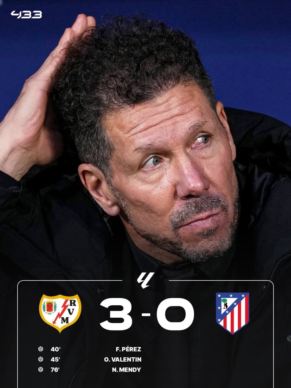 西甲第24轮,马竞客场0-3不敌巴列卡诺,遭遇2连败+4轮不胜,跌至积分榜第4,弗兰-佩雷斯、奥斯卡-瓦伦丁上半场尾声阶段连进2球,下半场诺贝尔-门迪再下一城。