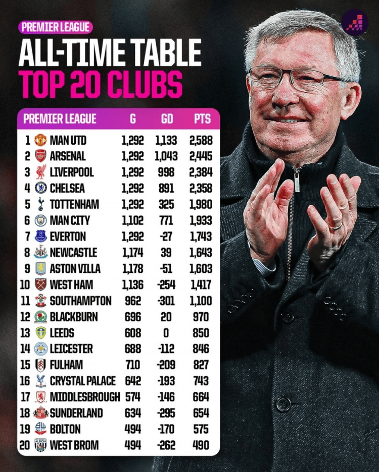 英超历史总积分榜:曼联2588分居首,阿森纳、利物浦前三