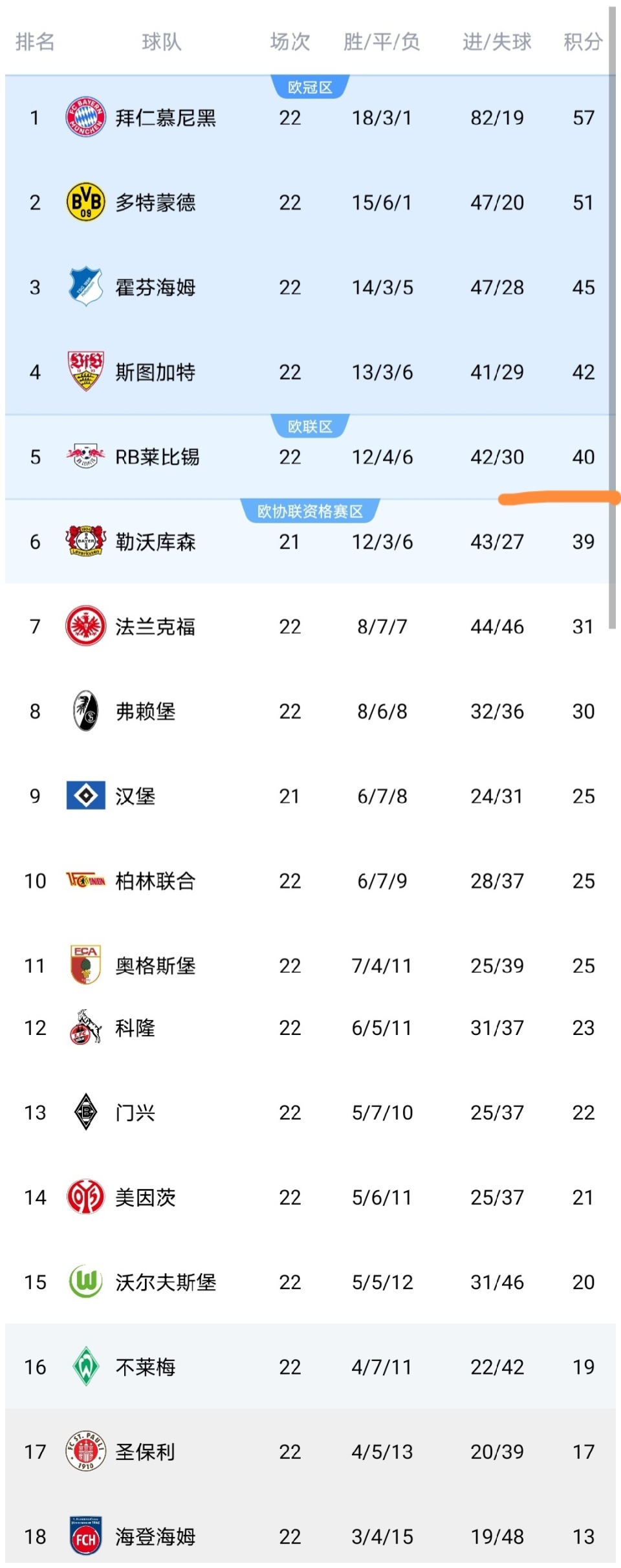 可以看到奥格斯堡赢球之后,积分上涨到了25分,排名第11,而海登海姆输球之后,积分停留在了13分,继续垫底。而沃尔夫斯堡队遭逼平之后,积分仅上涨至20分,排名第15,仅比降级区多1分,而莱比锡队逼平沃尔夫斯堡之后,积分上涨到了40分,排名第5,仅比第4的斯图加特队少2分。可以看到德甲冠军依然有悬念,争四相当激烈。