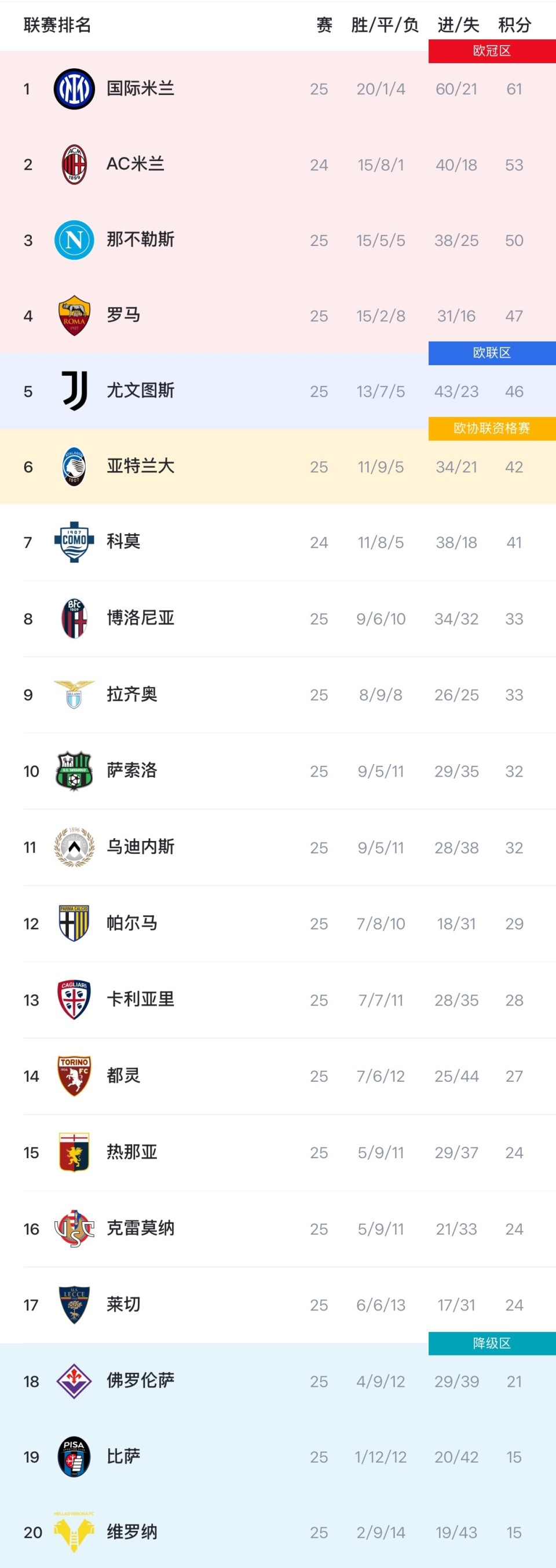 欧战区方面,亚特兰大客场2-0击败拉齐奥,继续稳住第六的位置;而博洛尼亚客场2-1击败都灵,在中游集团里抢到一场非常重要的胜利。