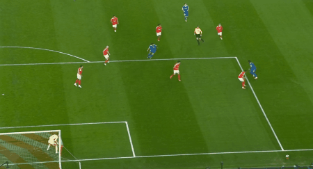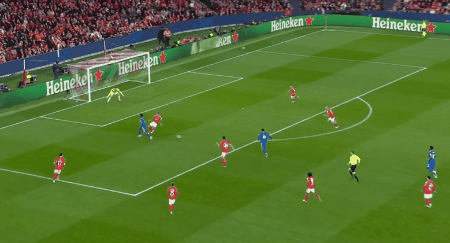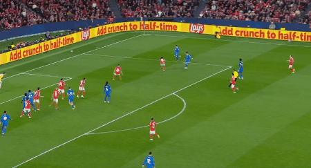 上半场补时第1分钟,居莱尔内切打门,特鲁宾做出精彩扑救。